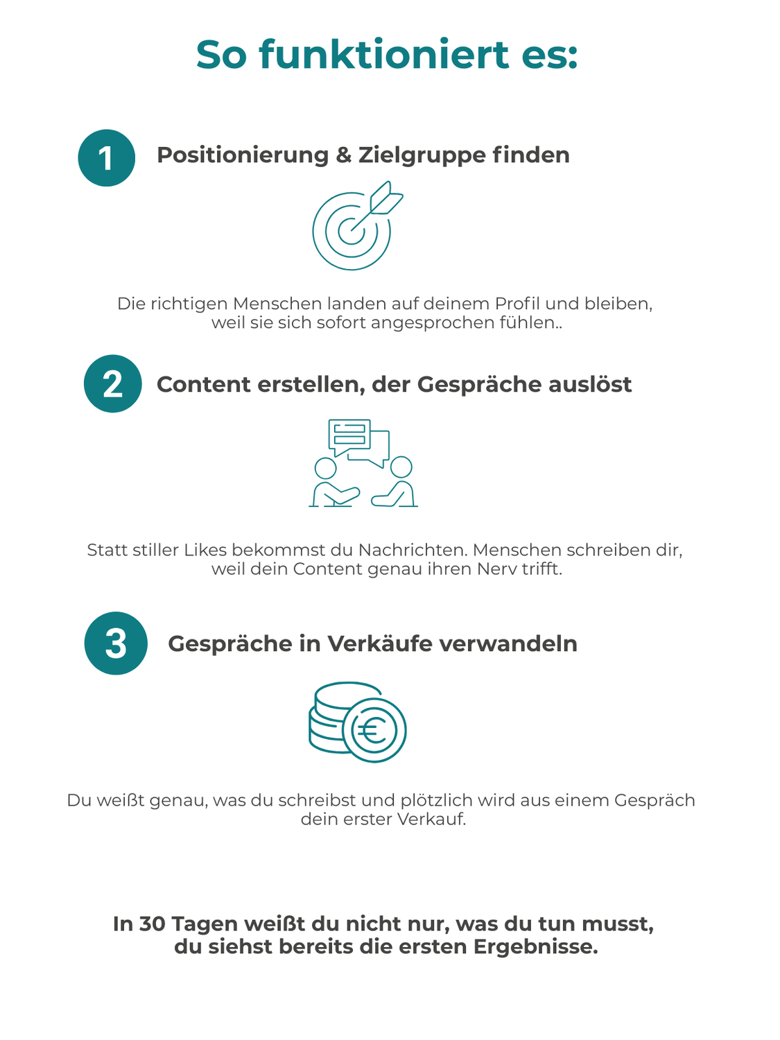 Nach 30 Tagen weißt du genau, wen du ansprechen willst, wie du Content erstellst der Gespräche auslöst und wie du daraus erste Verkäufe machst.